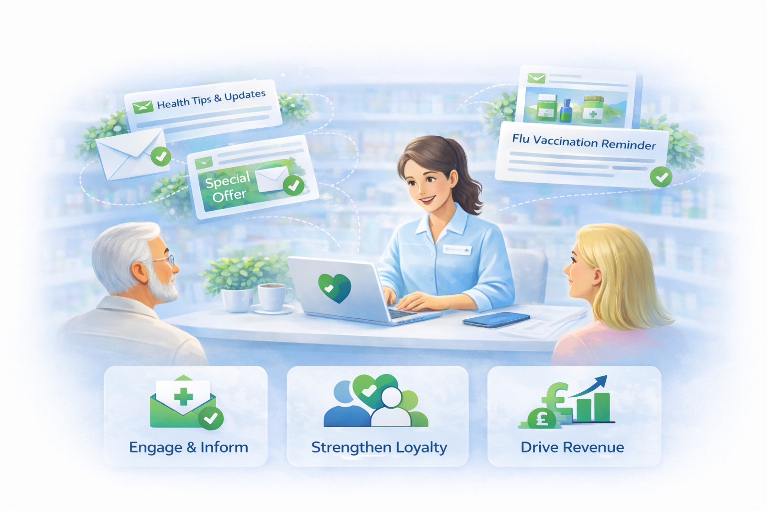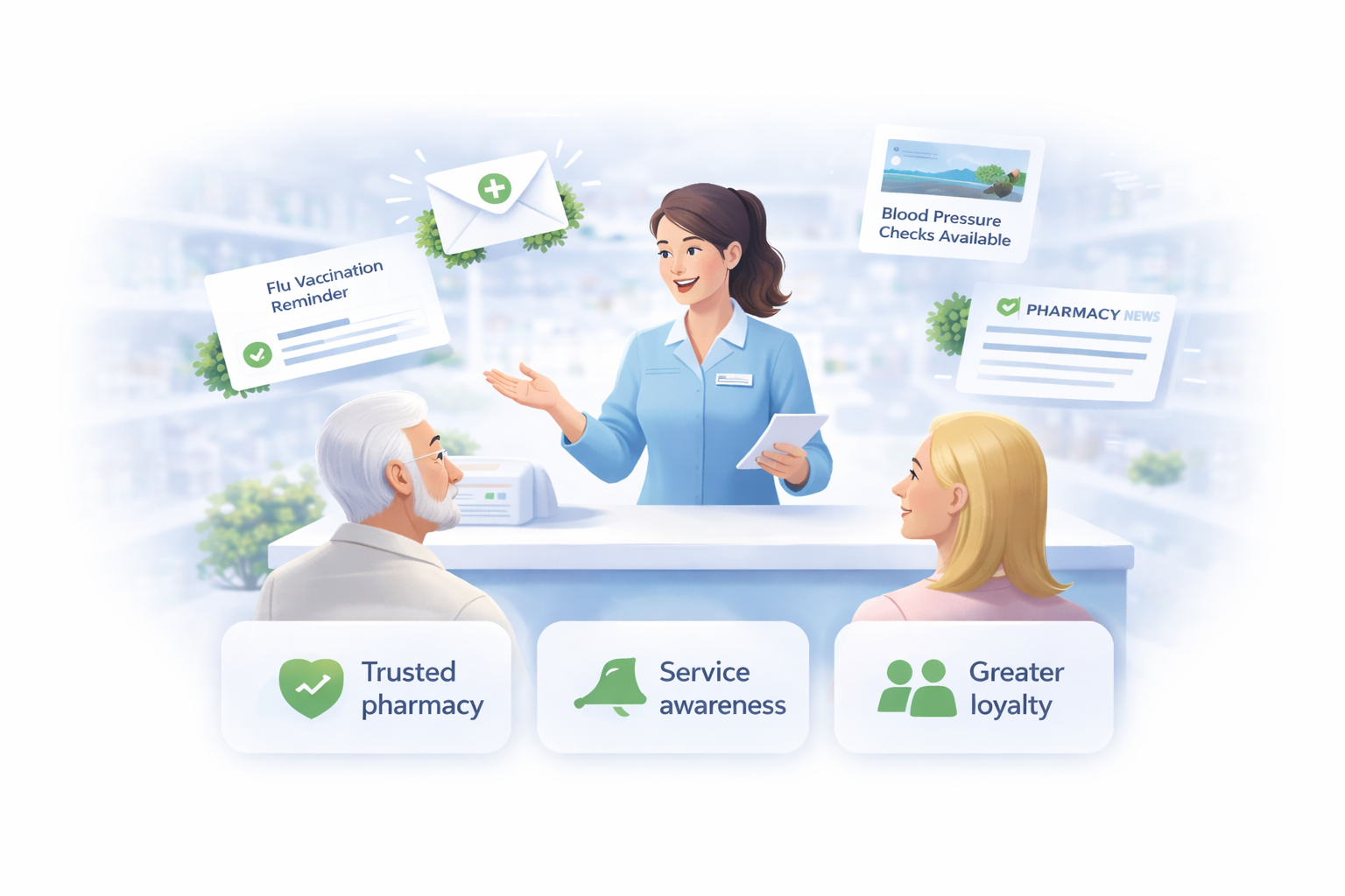 Regular professional communication keeps your pharmacy visible and reinforces long-term patient relationships.